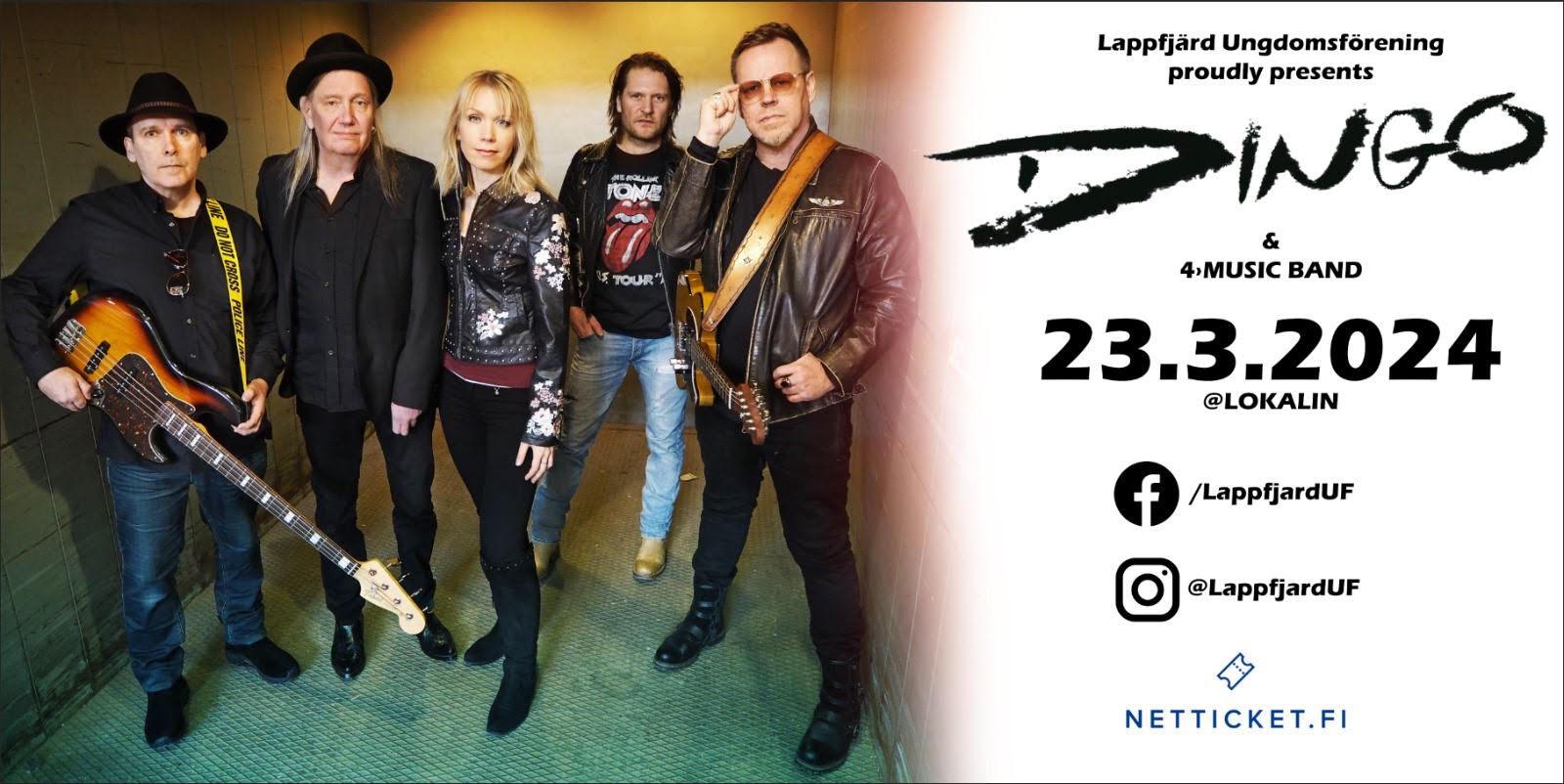 Med hits som "Nahkatakkinen Tyttö", "Sinä ja minä" och "Levoton Tuhkimo" var Dingo ett av de största banden i Finland under 80- och 90-talet. De turnerar fortfarande aktivt med en otrolig show, som nu kan upplevas på Lokalin. Österbottniska 4Musik Band lyfter stämningen till taket före Dingo.
