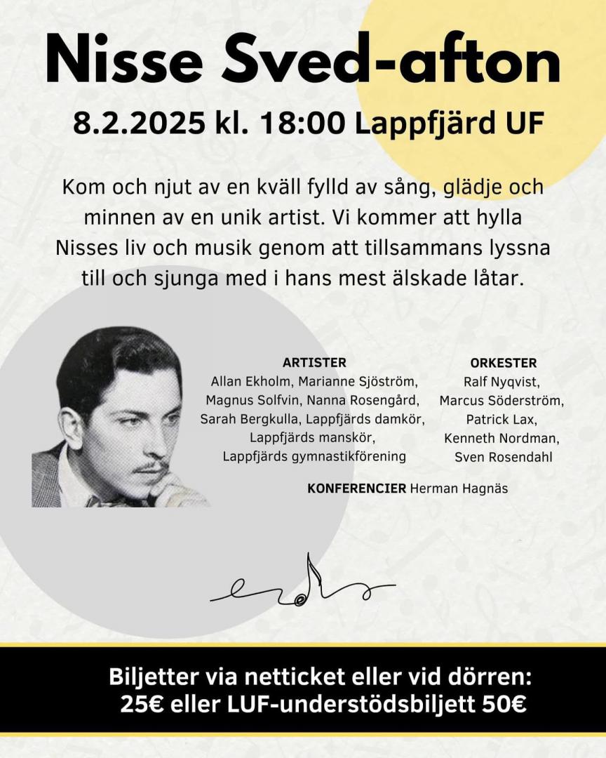 Den 8.2.2025 samlas vi för att hylla den legendariske artisten Nisse Sved. En kväll fylld av hans största hits, framförd av fantastiska musiker som själva inspirerats av Nisse.☺️